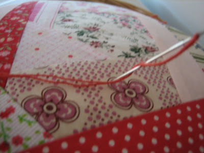 2- Tendo por base o círculo traçado, do tamanho da boca do cesto , comecei a preencher o circulo com patchwork crazy, utilizando retalhinhos que tenho cá em casa ( desta forma aproveita-se todas as sobras de tecidos que se tem).