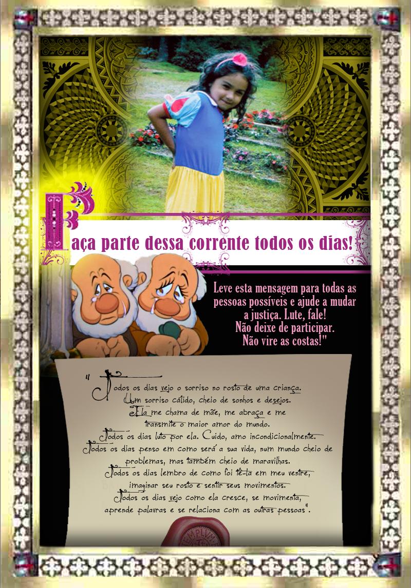 Se não levantarmos nossa voz para deixarmos bem claro que a decisão da justiça foi falha, que NENHUMA LEI AFASTA A FILHA DE UMA MÃE POR 90 DIAS, que um médico ou hospital errou muito por deixar que um estagiário cuidasse de uma menina que precisava de cuidados de um profissional muito bem treinado e com experiência, além de outros absurdos no caso de JOANNA... Vocês já leram sobre o caso? Já sabem o que está acontecendo? Se não levantarmos nossa voz para isso tudo, qual legado deixaremos para os nossos filhos? Que ter influência e dinheiro é tudo na vida? Que essa influência pode superar o amor e a dor?